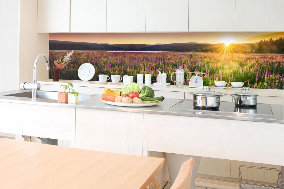 KI-350-145 Самозалепващ фототапет за кухня – Залез върху поляна 350 x 60 см