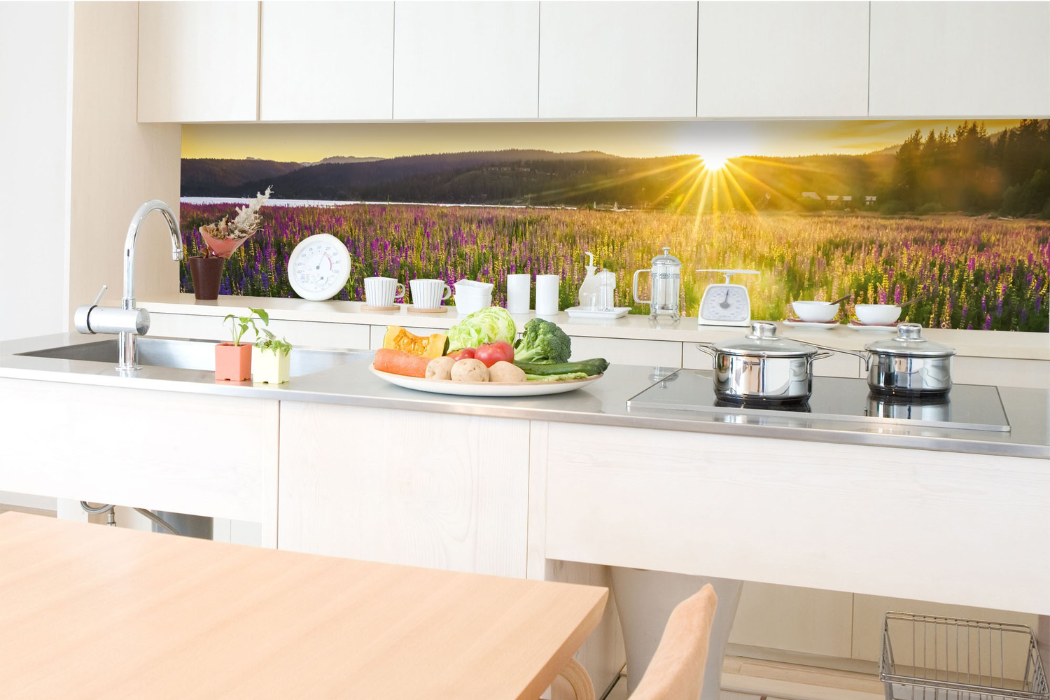KI-350-201 Самозалепващ фототапет за кухня – Слънчеви лъчи над поляната 350 x 60 см