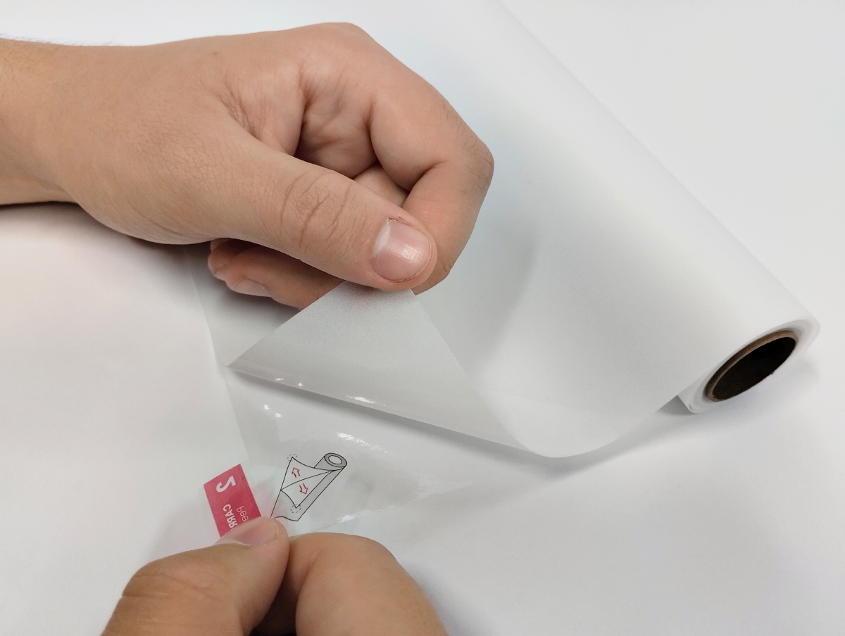 премахване на защитния филм от фолиото и поставяне на статичното фолио с една и съща страна към основата