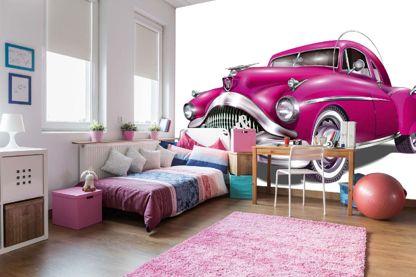 Самозалепваща се флизелинова фототапета Ретро розова кола 375 x 250 см