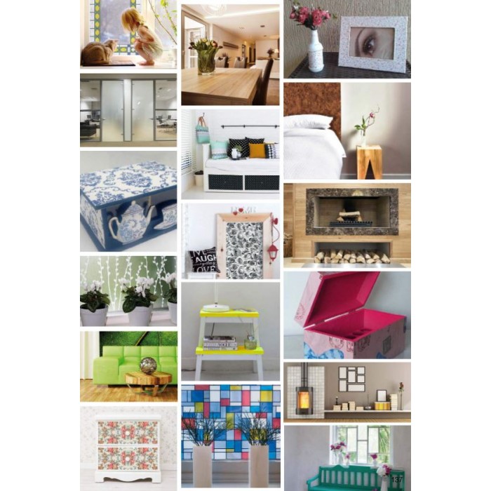 Подробно описание: Фолиото може да се залепи върху всякакъв непопиващ подложен материал (ламинат, фазер, метал, стъкло, пластмаса, лакирано дърво, ПДЧ и др.). Фолиото може също да се използва за обновяване на стари мебели, шкафове или кухненски шкафове, или просто за покриване на несъвършенства на предмети, засегнати от времето. Фолиото може да се нанася и върху детски мебели, играчки, книги или тетрадки. Различните мотиви се изрязват и нанасят много лесно върху подготвени, гладки и непопиващи повърхности. Повече информация можете да намерите в следващата секция или в раздел ИНСТРУКЦИИ.