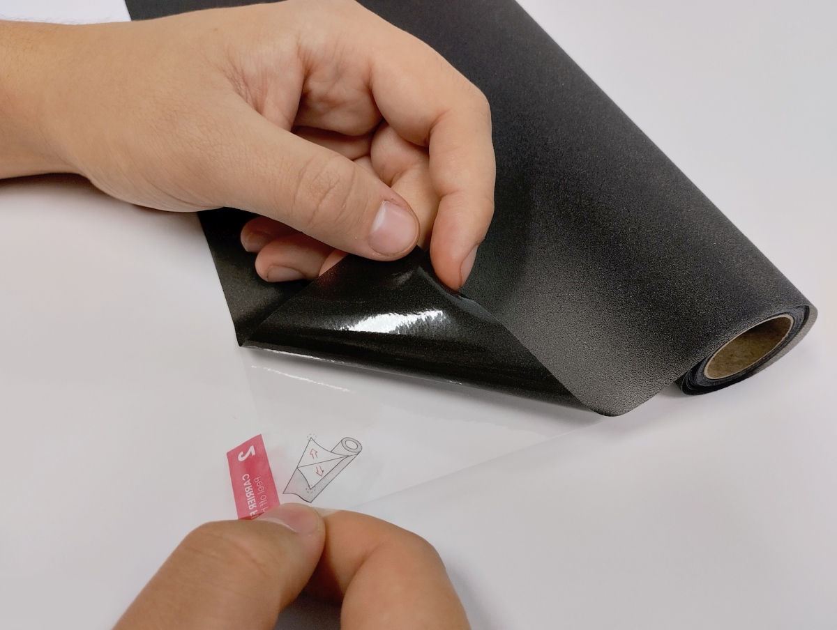 премахване на защитния филм от фолиото и поставяне на статичното фолио с една и съща страна към основата